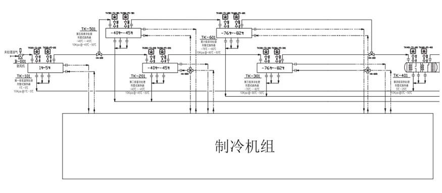 將揮發VOCs氣體導入到設備冷箱(裝置zui多設置冷凝溫度3℃-40C-75C-115C)可以定制其他溫度區,根據需求進行逐級冷凝液化。部分連續生產工藝在低溫段做了雙路切換工藝(一側冰堵后,直接切換到另一路換熱冷箱冷凝,同時冰堵側做融霜處理。)